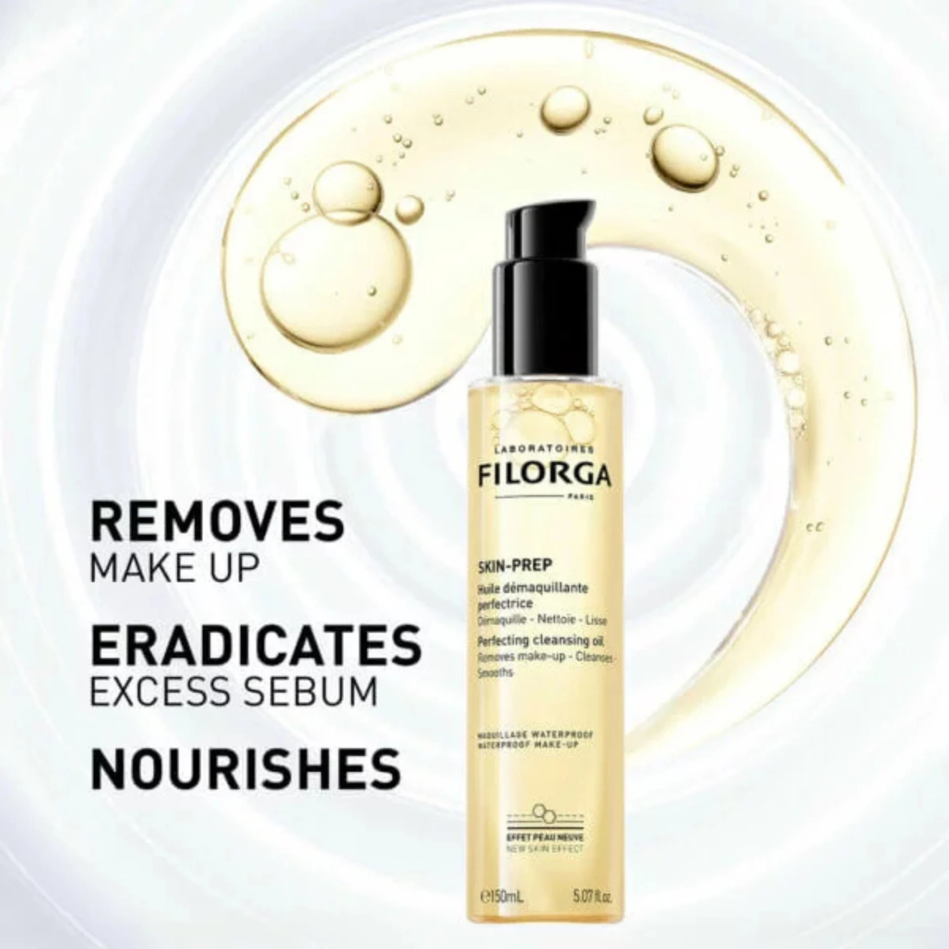 Apply Filorga Skin Prep Cleansing Oil to dry skin and gently massage in circular motions. Add water to emulsify the oil into a milk, then rinse thoroughly. Use daily, morning and/or evening, as the first step in your skincare regimen. For a complete cleansing routine, combine with the Filorga Enzymatic Cleansing Foam 150ml or Filorga Skin Prep AHA Cleansing Gel 150ml for optimal results.
